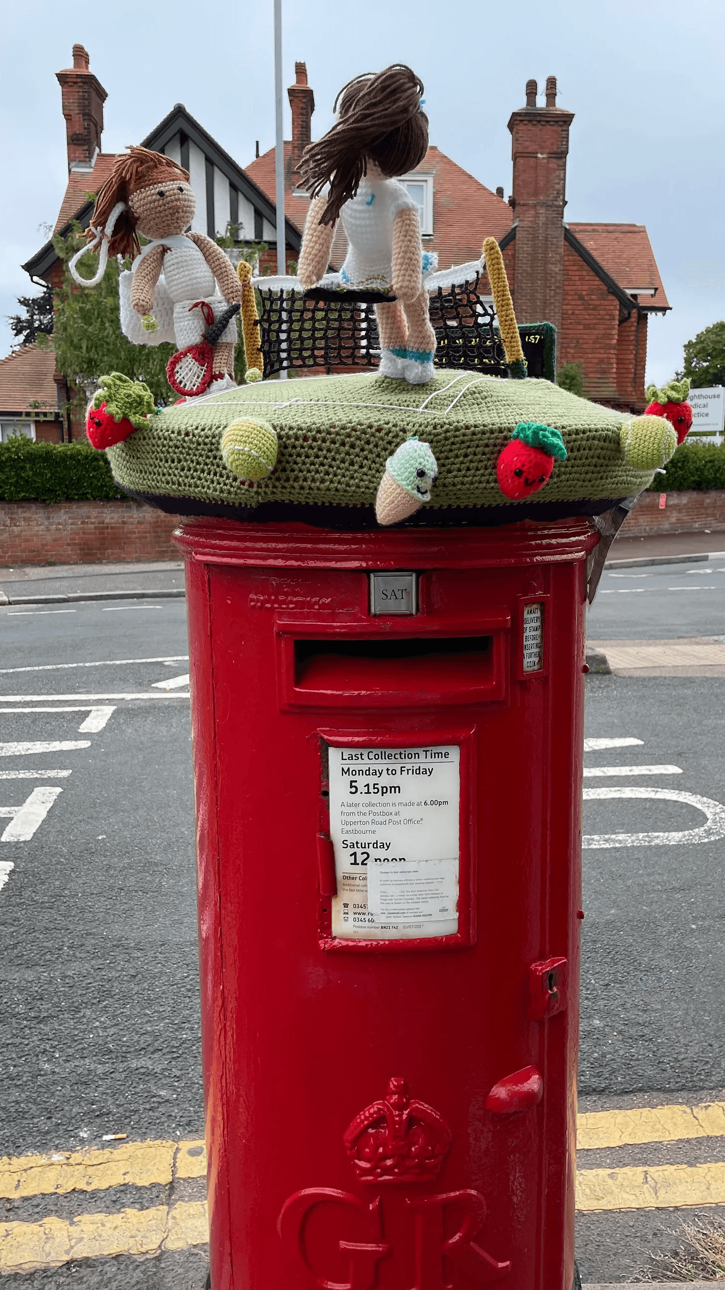 An Eastbourne “postbox topper,” a knitted or crocheted decorations that sit on top of traditional postboxes inspired by the tournament.