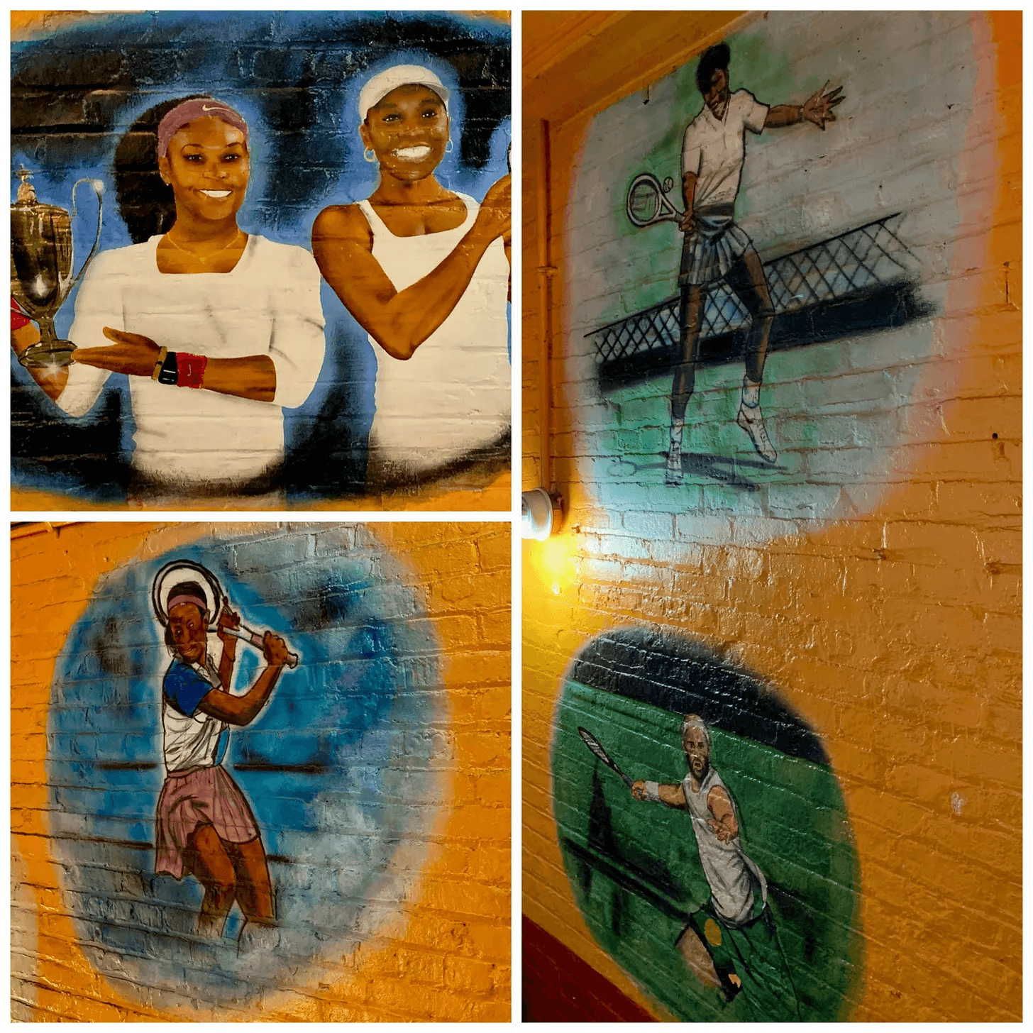 Graffiti portraits of some of the great Black tennis players of the modern era line the stairs leading up to the court-office at the Harlem Armory Tennis Center.