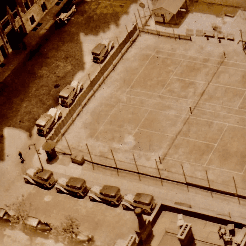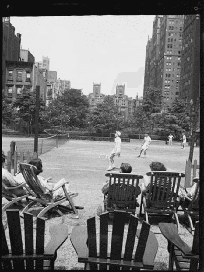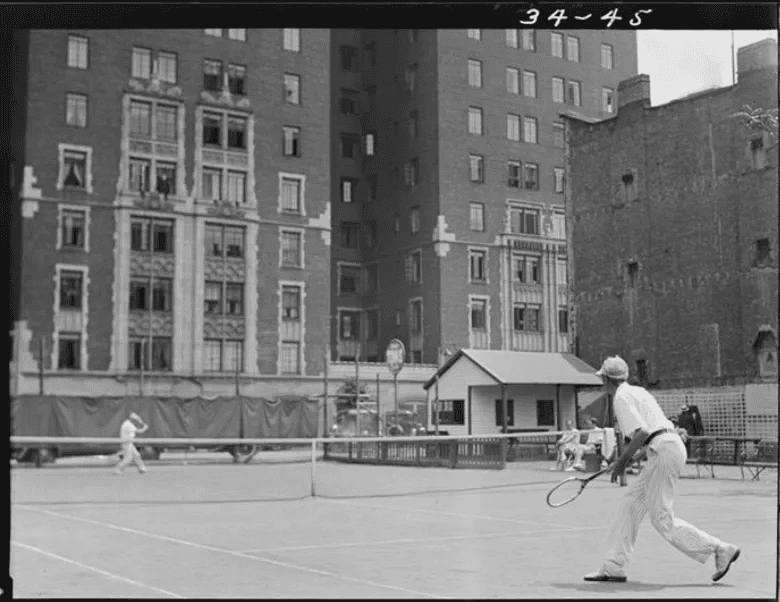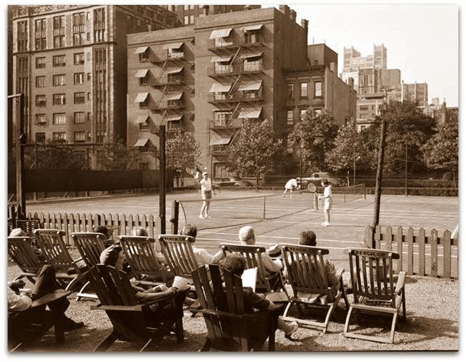 Tennis courts came to Tudor City not by design but by a twist of fate. The roaring 20s brought that building boom; the Depression caused a lull. The Fred F. French Company owned the entire development rising above 42nd Street and 1st Avenue, advertised as a respite from life on the commuter train. But French put the brakes on constructing another edifice of studio and one-bedroom apartments. Instead, he did something communal: he set the land aside for activities, such as concerts, dancing, ice skating and even ski sliding. Tennis stuck.