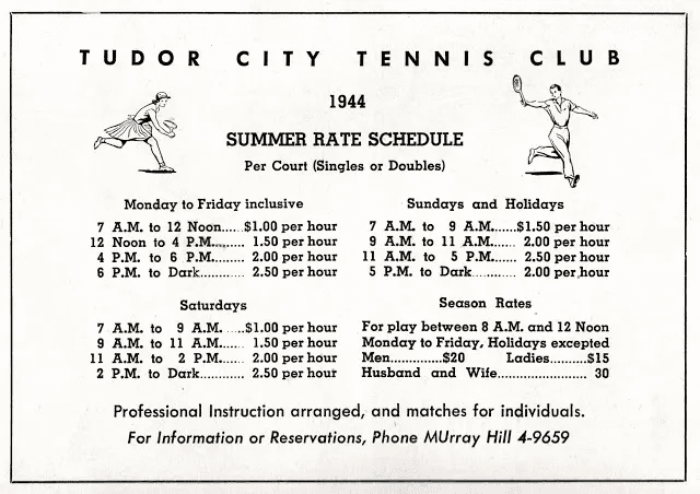 Inaugurated in May 1933, the Tudor City Courts arrived when there were few outdoor courts in Manhattan — and only one indoor (the Heights Casino in Brooklyn). Forest Hills was long opened and Central Park had consolidated into one central location from many random, hand-lined courts, but Tudor City had it all: location, East River views and a place to sun. It was also dirt cheap: about $1 per hour ($14 adjusted for inflation) during off-peak and $2.50 during peak ($34).